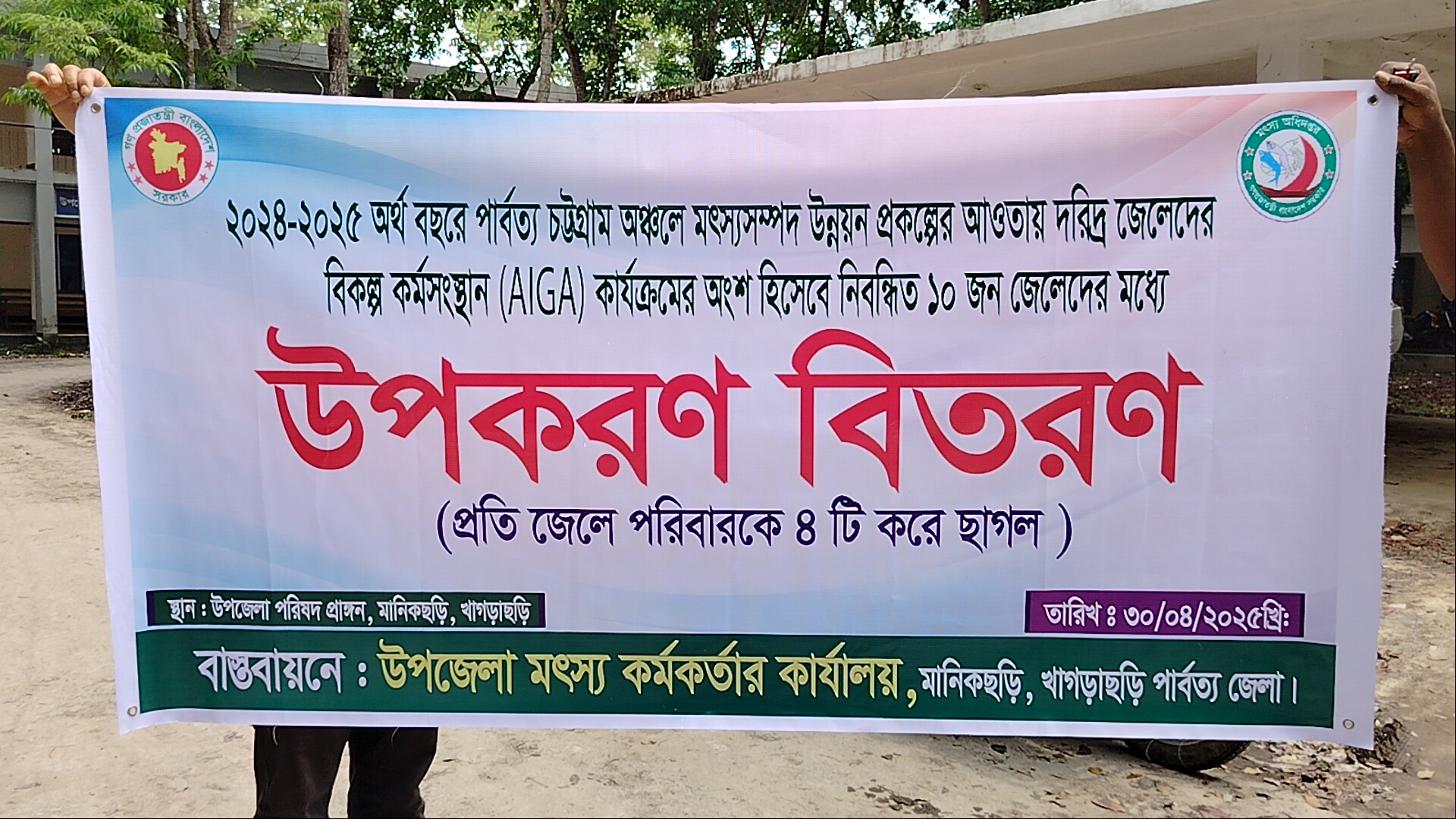 ২০২৪-২০২৫ অর্থ বছরে পার্বত্য চট্টগ্রাম অঞ্চলে মৎস্যসম্পদ উন্নয়ন প্রকল্পের আওতায় দরিদ্র জেলেদের বিকল্প কর্মসংস্থান (AIGA) কার্যক্রমের অংশ হিসেবে নিবন্ধিত ১০ জন জেলেদের মধ্যে উপকরণ বিতরণ